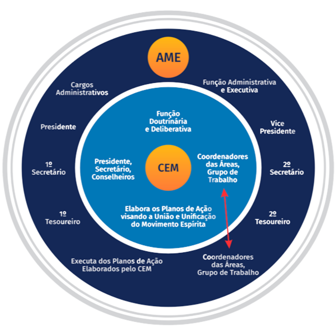 A AME é a unidade federativa de âmbito municipal, sem finalidade lucrativa e de duração indeterminada, constituída de acordo com as resoluções do III Congresso Espírita Mineiro. Executa as atividades deliberadas pelo Conselho Espírita Municipal – CEM.